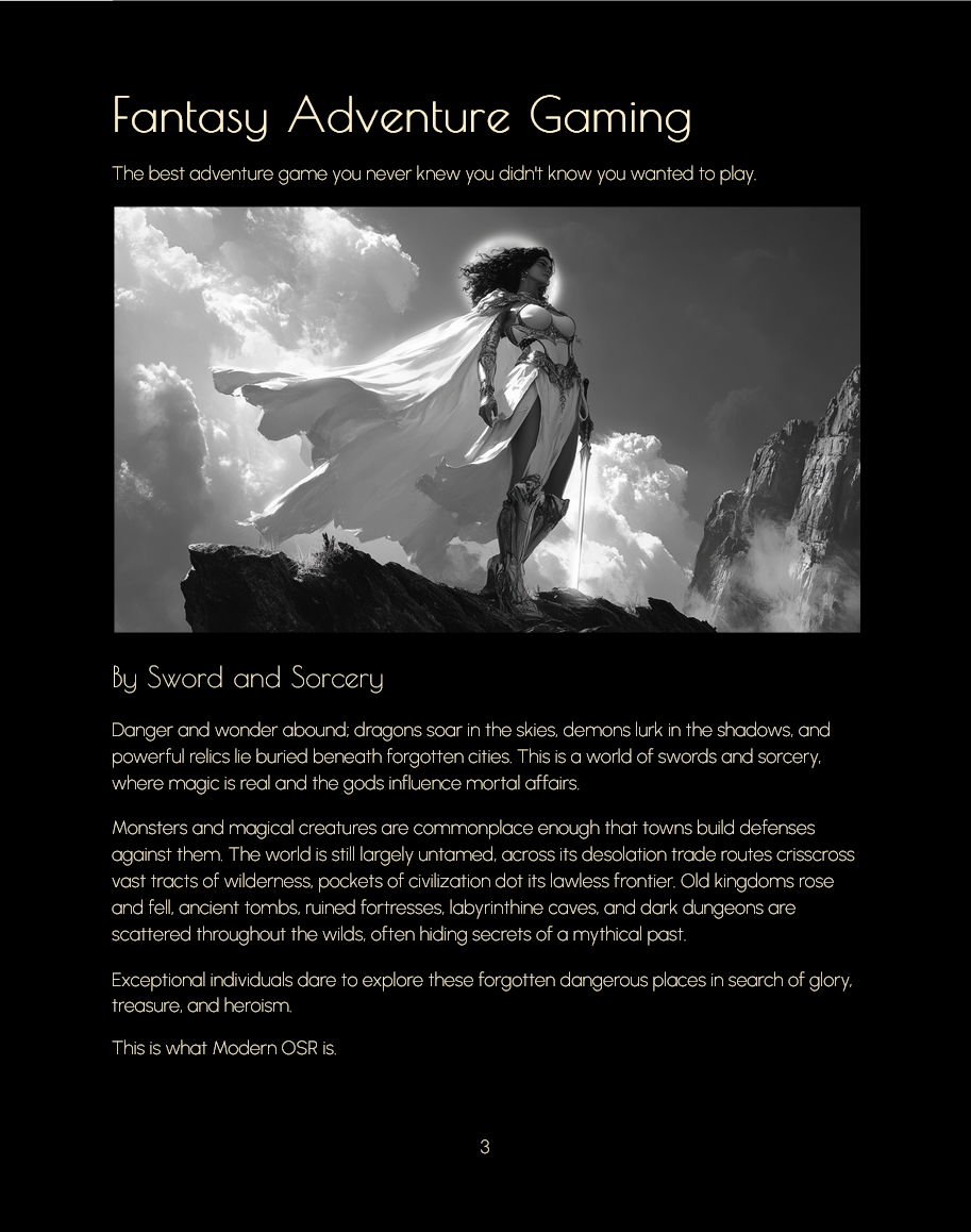 Monsters and magical creatures are commonplace enough that towns build defenses against them. The world is still largely untamed. Trade routes crisscross vast tracts of wilderness, pockets of civilization dot its lawless frontier. Old kingdoms rose and fell, ancient tombs, ruined fortresses, labyrinthine caves, and dark dungeons are scattered throughout the wilds, often hiding secrets of a mythical past.