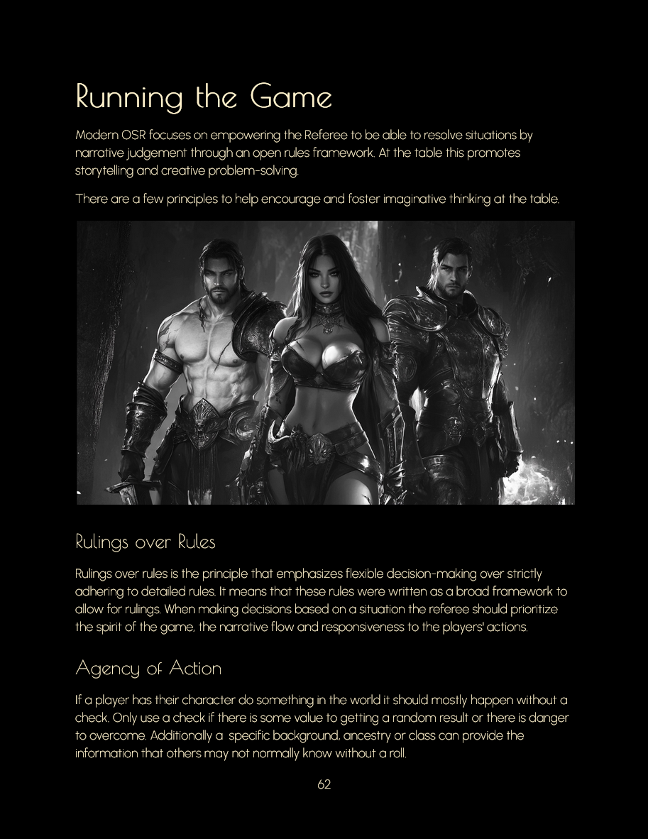 Modern OSR focuses on empowering the Referee to be able to resolve situations by narrative judgement through an open rules framework. At the table this promotes storytelling and creative problem-solving. There are a few principles to help encourage and foster imaginative thinking at the table.